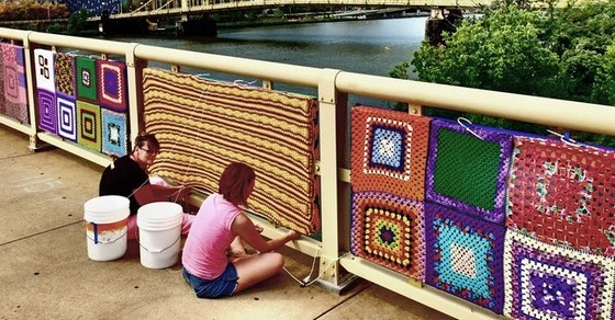 Одна из самых масштабных акций участников этого необычного движения прошла недавно в городе Питтсбурге в американском штате Пенсильвания. Тамошние любители пряжи, позвав «коллег» со своей страны, собрались группой в 1800 человек и связали новую «одежку» для моста имени Энди Уорхолла в центре упомянутого выше мегаполиса.