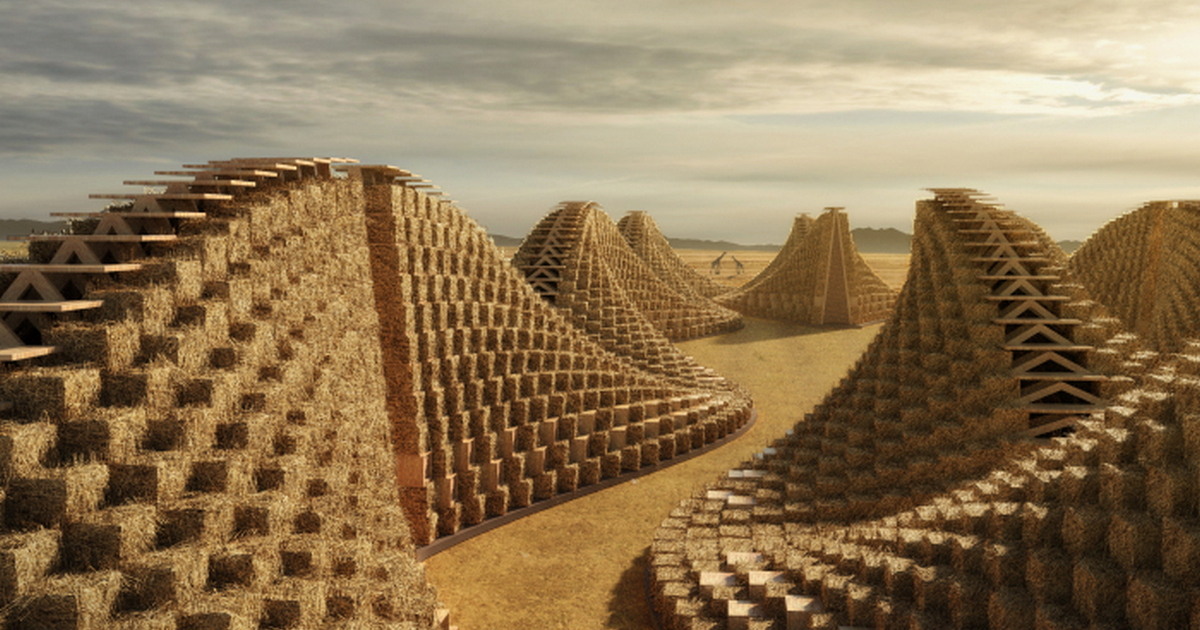Эту абстрактную композицию в футуристическом стиле разработало индийское архитектурное бюро Nudes под руководством Нуру Карима. Проект представляет собой комплекс зданий (хотя по сути это даже не здания, а арт-объекты) с конструкцией «лестничного» типа, созданной по типу стремянки, и стенами из брикетов «дышащей» соломы.