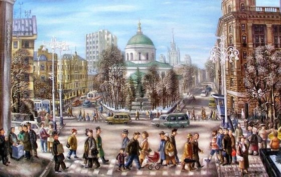 Сам же примитив Сергея Волкова, как художественный прием, буквально пропитан атмосферой мягкого лиризма, тонкой иронией и легким комизмом. Этот прием чувствуется в изображении даже мельчайших деталей столичной жизни. Казалось бы, стилизованные примитивные картины – фантазируй сколько душе угодно. А нет, живописец – все, что касается архитектурных ансамблей, автомобильного транспорта, моды в одежде, да и многих других подробностей, постарался запечатлеть и донести до зрителя с документальной достоверностью.