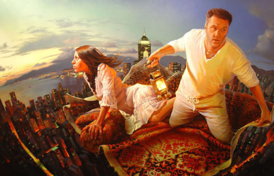 В каждом полотне этого автора видится маленькая сказка, наполненная чарующими эмоциями. Здесь и высотные здания, вниз которых уходят причудливые, бурлящие пеной водопады, а вокруг порхают птицы, в ожидании своей порции рыбы. На другой картине ковёр-самолёт везёт своих спутников над ночным, современным городом, создавая ощущение реалистичности и одновременно с этим метафоричности происходящего.