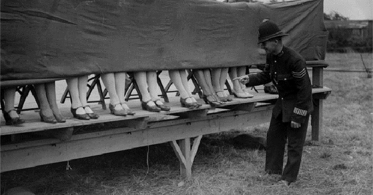 8. Полицейский оценивает лодыжки участниц конкурса красоты в Лондоне, 1930 год