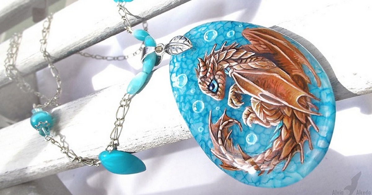 Талантливая художница из России Alvia Alcedo вручную разрисовывает ожерелья и подвески из поделочного камня агата. На украшениях она изображает фантастических существ - драконов.