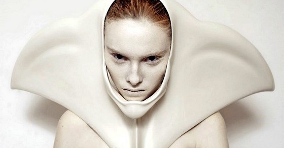 В этом проекте, впрочем, человек остается человеком, разве что в результате мутации, обратной эволюции, обзаводится странными, диковинными артефактами. Нет, хвост у него не отрастает вновь, - в роли артефактов выступают загадочные дизайнерские аксессуары, арт-объекты в виде рогов, клыков, бивней, щитов и прочих "инородных образований". Повторяя контуры лица, подчеркивая или сглаживая некоторые его особенности, эти аксессуары выглядят как продолжение человеческого тела. Словно здесь им - самое место.