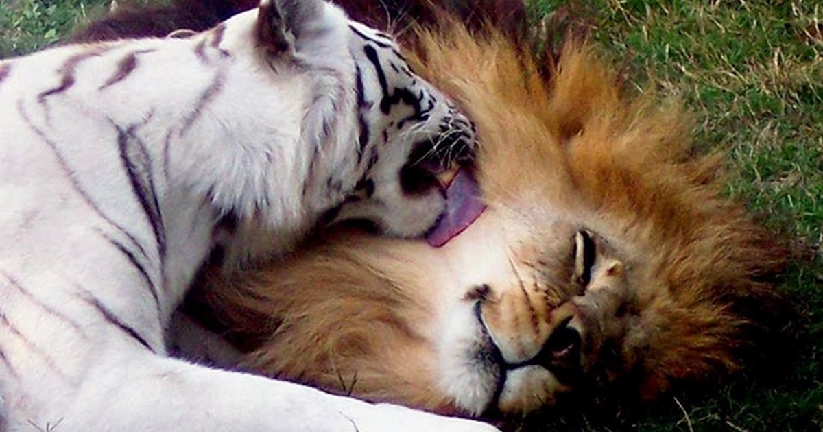 Любовь не знает границ: африканский лев и тигрица-альбинос живут вместе в зоопарке