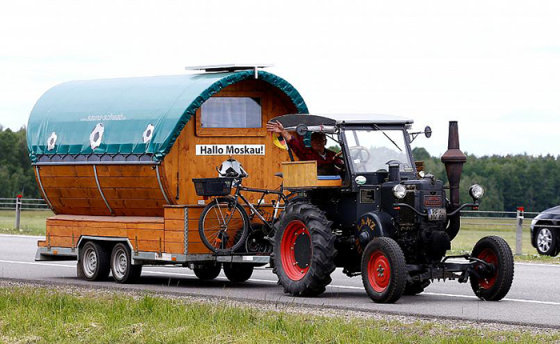 Как быстро Хуберту удастся преодолеть все это расстояние? Трудно сказать, ведь его транспорт - настоящий раритет 1936 года выпуска. Хуберт Вирт (Hubert Wirth) сам отреставрировал свой старый трактор, и сейчас не спеша едет на нем со скоростью, не превышающей 30 км/ч. Сам пенсионер рассчитывает добраться до Москвы за десять дней, остановившись на денек-другой по дороге в Минске.