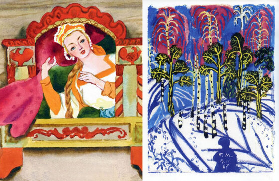 О Татьяне Алексеевне Мавриной написано и сказано очень много, особенно в последние годы. Заслуженный художник РСФСР, лауреат Государственной премии СССР и Премии им. Г.Х. Андерсена за вклад в иллюстрирование детских книг, она создала множество ярких, смелых, потрясающих по силе воздействия иллюстраций. На ее художественный язык повлияла архитектура и природа Нижнего Новгорода, ярмарки и народная игрушка, виденные в детстве, сказки и домашний театр, сопровождавший их чтение. Она училась во ВХУТЕМАСе в годы больших преобразований – в том числе и в искусстве, и в его преподавании. Педагоги поощряли в студентах стремление к творческим экспериментам, а сама Маврина вспоминала, что каждый вечер думала лишь об одном – скорее бы наступило завтра, скорее бы вернуться в мастерскую. Хотя акварельная и гуашевая живопись во ВХУТЕМАСе не поощрялись, именно эти техники она выбрала для дальнейшей работы. В предвоенные годы иллюстрировала преимущественно классические произведения, однако после, особенно в шестидесятые и семидесятые, обратилась к сказкам Пушкина и к народной сказке. Яркий колорит, экспрессивная манера письма, живость и легкость в иллюстрациях Мавриной близки народному декоративно-прикладному искусству (в них можно найти отголоски глиняной игрушки, русского лубка, бытовой керамики, пряников, изразцов, старинных костюмов), и, как следствие, как нельзя лучше отражают настроение русской сказки.