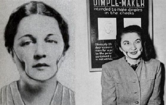В 1920-30-х годах было модно иметь ямочки на щеках, как у знаменитой Марлен Дитрих. В 1936-м некая Изабелла Гилберт даже изобрела специальное устройство, которое делает ямочки. Машина представляла собой что-то вроде пружины, обхватывающей лицо, и двух маленьких ручек, которые вдавливались в щеки.