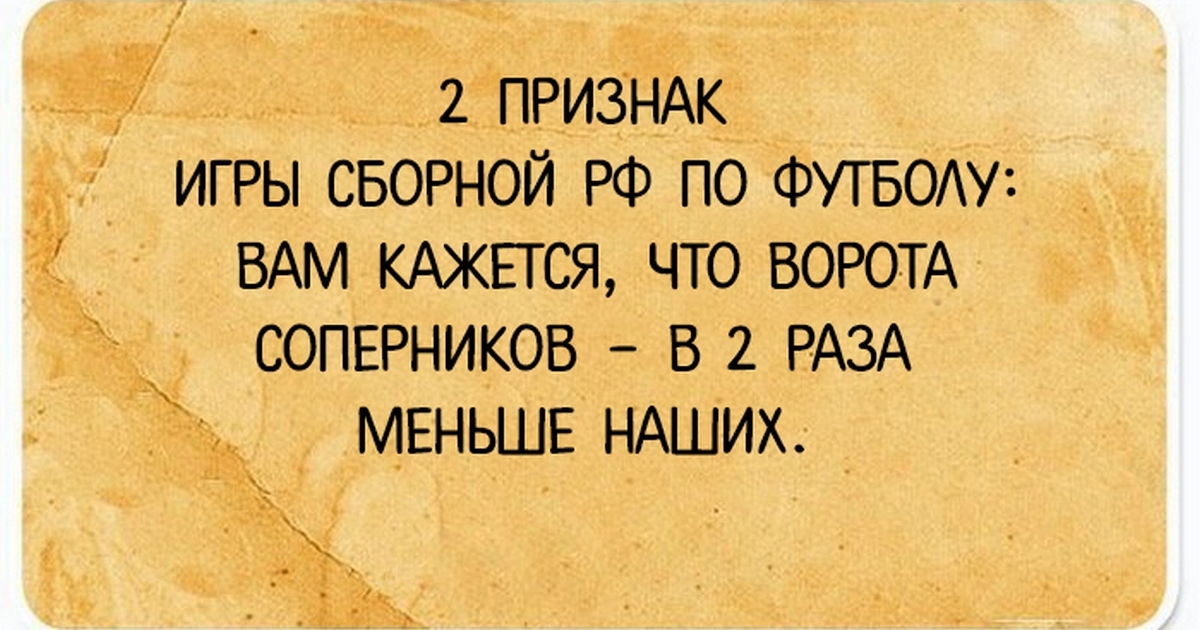Проходивший недавно во Франции чемпионат мира по футболу принёс российским болельщикам очередную порцию разочарования. А ещё массу добрых (и не очень) шуток по поводу отечественного футбола. В нашем обзоре открытки, которые позволят даже новичкам среди футбольных болельщиков точно определять, когда на поле выходит российская сборная.