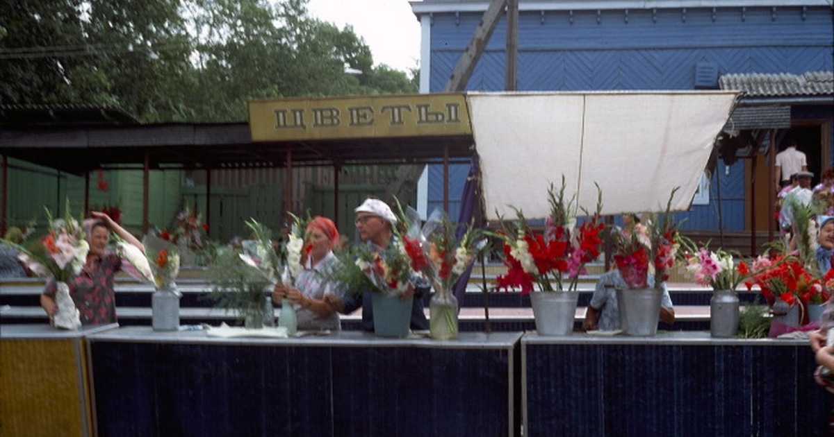 Колхозники, торгующие цветами на рынке в Хабаровске.