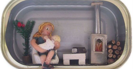 Удивительно, но все эти занятные диорамы, изображающие жизнь простых обитателей маленьких квартир, художница размещает в крохотных банках из-под сардин. Получается немного наивно, трогательно и очень узнаваемо.