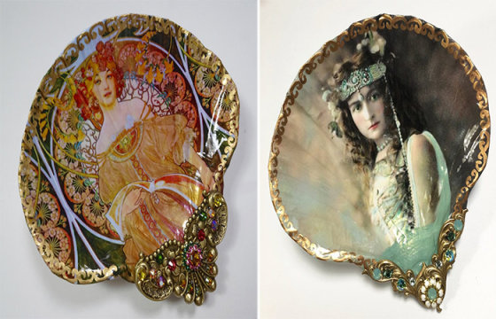 Уникальность её работы заключается в особой технике исполнения. Мэри работает в стиле декупажа, то есть покрывает всю поверхность ракушки выбранным и заранее продуманным изображением. После того, как картинка закончена, она наносит на неё декор и последние штрихи: золочённую краску, блестящую в лучах солнца, разнообразные трёхмерные украшения, самыми популярными из которых являются стразы и латунные детали от Сваровски. Всё это отлично гармонирует и дополняет картинки, что находятся в глубине ракушек: чувственных русалок в окружении морских просторов, женщин-бабочек, что распахивают свои крылья навстречу этому миру, подражая танцовщицам из 60-х годов, портреты знатных дам и аристократок, блестящие, манящие каждой деталью и трепещущими крыльями стрекозы и многое другое. Всё это не оставляет никаких сомнений в том, что такое уникальное и стильное украшение, на ряду с веерами, ручными зеркальцами и многим другим, могло в своё время принадлежать знатной даме из высшего света, что любила похвастаться своими находками и приобретениями ручной работы.