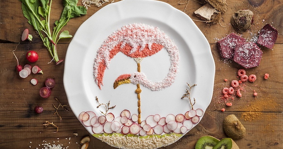 Анна Джойс творчески подошла к процессу: перед нами утонченный фламинго из измельченных фруктовых хлопьев, мудрая сова из риса и лапши, птичка-невеличка с оранжевым опереньем из моркови. Рядом с «рисунками» фотограф разместил те продукты, которые были использованы художницей.