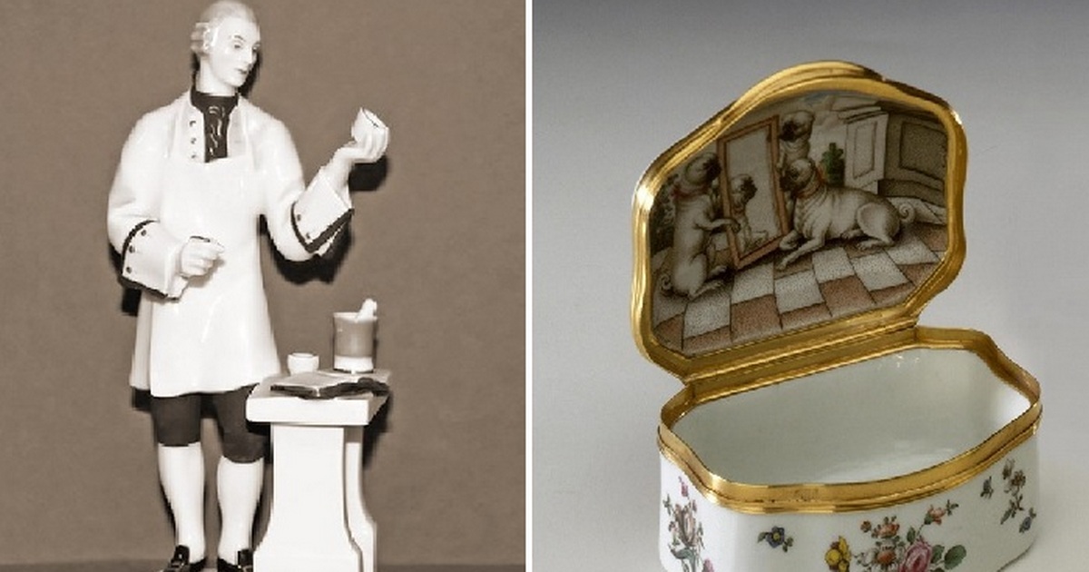 Табакерка в виде «комода» с изображением мопсов на крышке. 1752 г.