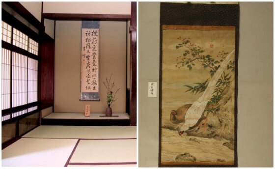 А этими предметами могут быть цветочная композиция – икебана, курильница для благовоний – вообще что-то самое красивое и ценное, чем хозяин дома хочет любоваться сам и что хотел бы показать своим гостям. На стене в глубине ниши располагается какэмоно – это вертикально расположенный свиток, шелковый или бумажный, на котором изображен рисунок или каллиграфическая надпись – девиз, изречение, стихотворение.