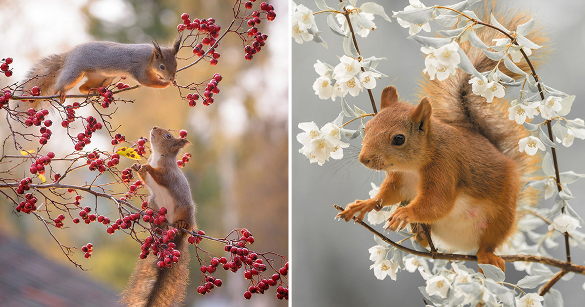 А вскоре на террасу заглянули белки — и именно они в итоге стали главными героями фотографий Хеерта. Имея уже опыт работы с пугливой птицей, ему стало легче «приручить» любопытных грызунов. Он стал сооружать для них различные мелкие декорации, чтобы получить сюжетные снимки. И надо признать, снимки получаются просто великолепные! Вот уже шесть лет Хеерт фотографирует белочек у себя рядом с домом, и это стало его основной - и очень любимой - работой!