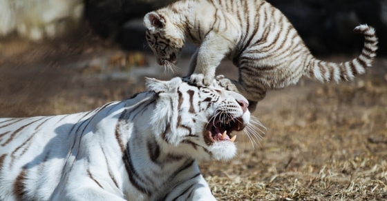Тигрёнок белого бенгальского тигра играет в вольере. Фотограф: Александр Лукин.