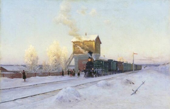 «На полустанке. Зимнее утро на Уральской железной дороге». (1891 год). 62,5 х 90 см. Холст, масло. Фрагмент. Художник: Владимир Казанцев. (Иркутский областной художественный музей им. В.П. Сукачёва.)