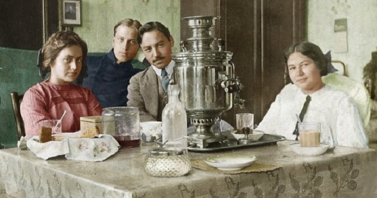 Колоризированая фотография, иллюстрирующая одну из любимых русских традиций.