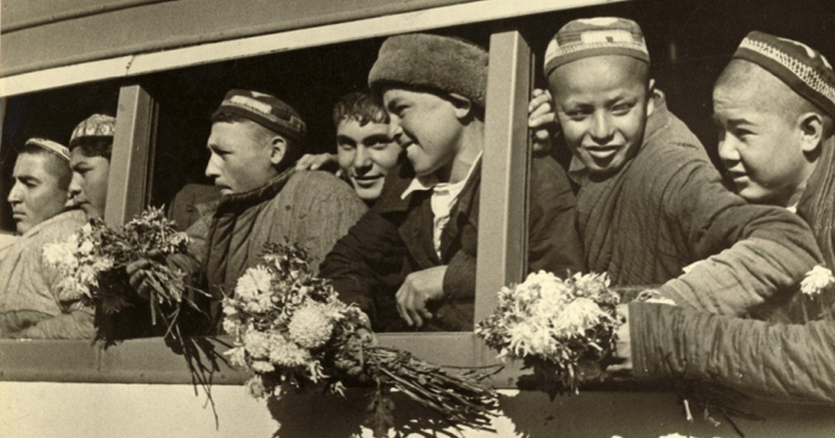 Узбекские дети прибыли в Ташкент, чтобы поступить в техникум. Ташкент, начало 1930 года. Фото: Max Penson.