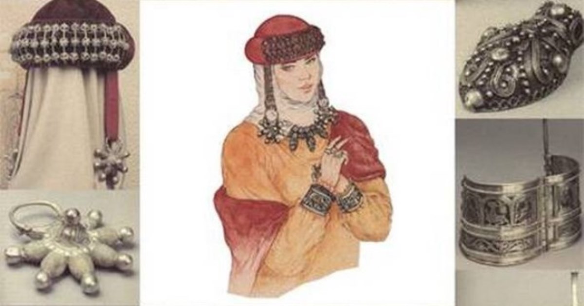 Слева – Знатная женщина в парадном уборе. Справа – Княжеские украшения для торжественных церемоний. Рисунки А. Чебыкина | Фото: rusarch.ru