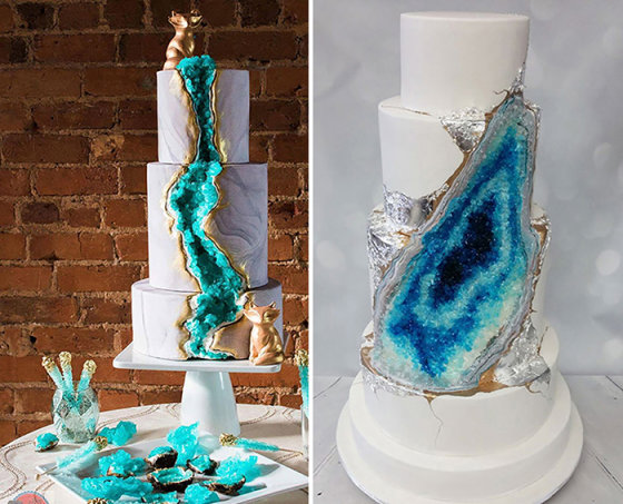 Идея роскошного декора принадлежит Рашель Тейфель (Rachel Teufel). Около полугода назад она презентовала шикарный торт, который напоминал огромный аметист. Его фотографии быстро разлетелись по Интернету, и сегодня декораторы по всему миру создают вариации на эту тему. Сапфиры, изумруды, аметисты и аквамарины — разнообразные полудрагоценные камни вдохновляют дизайнеров в зависимости того, какой «основной» цвет свадьбы был выбран.