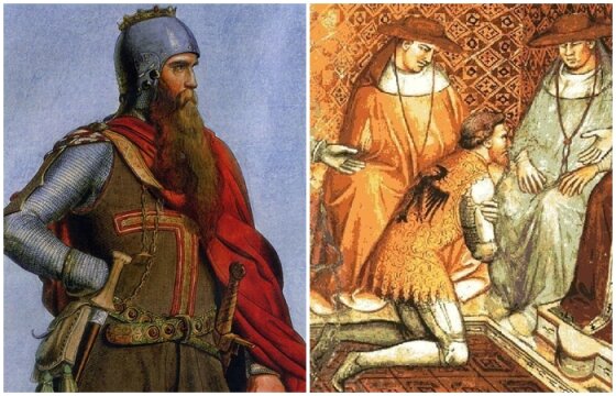 Слева направо: Фридрих I Барбаросса — крестоносец, миниатюра из рукописи, 1188 год. \ Фридрих I Барбаросса (в центре), изображение XIII века.