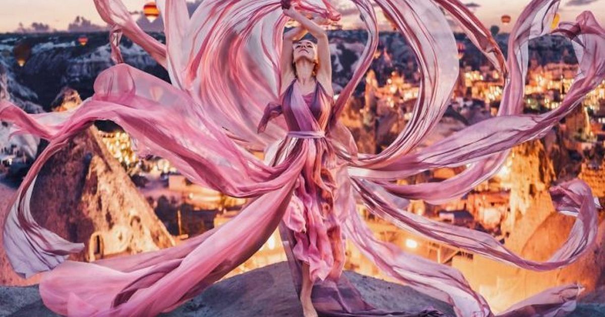 Грациозная Катерина Зайцева в воздушном розовом платье на фоне фантастического ландшафта Каппадокии, Турция.