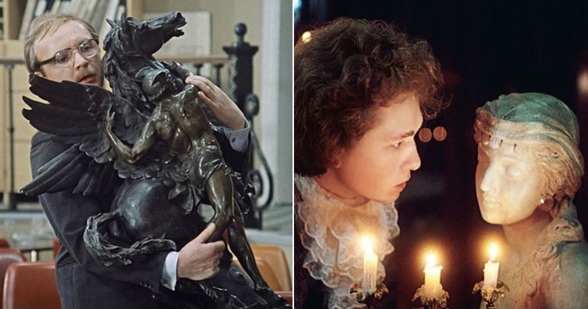 Затем статуя перекочевала в «Служебный роман» – рекордсмен по количеству самого ходового реквизита «Мосфильма». Из-за ног этой статуи выглядывал бедный Бубликов, наблюдающий за женскими ножками, снующими мимо него вверх и вниз по лестнице.