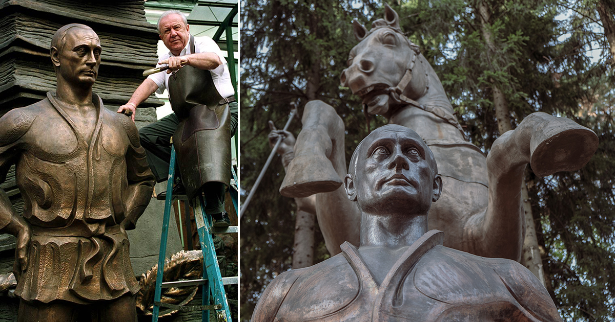 Например, на фигуру Путина сзади напрыгивает огромный конь. Наездник пытается поразить копьем дракона, который лежит тут же, за спиной президента. Те, кто хорошо знаком с творчеством скульптора, находят большое сходство с аналогичной Церетелиевской скульптурой св. Георгия Победоносца с драконом, установленной в 1990 году возле здания ООН в Америке и названной «Добро побеждает зло».