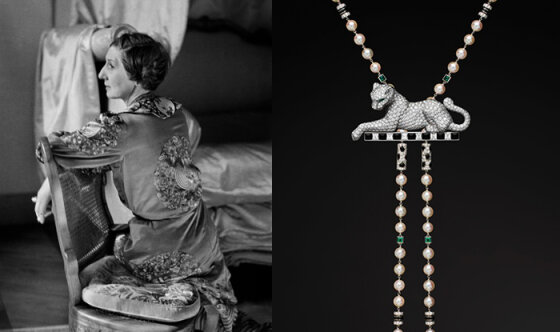 Первые украшения Cartier с мотивом пантеры появились в 1914-1915 годах под влиянием уходящего искусства модерна с ее роковыми красавицами и темным эротизмом. Эксцентричные богачки тех лет любили окружать себя экзотическими кошками и ассоциировать себя с дикими животными, грациозными и смертельно опасными. В то же время именно образы стремительных хищников так любили дизайнеры следующего по хронологии «роскошного» стиля – ар деко. Пантера Cartier появилась в нужное время, став ностальгическим образом для поклонниц модерна и предвосхитив динамизм, страсть и агрессию молодого поколения. Вместе с первыми ювелирными часами, декорированными фигурами пантер, в магазинах Картье появились и рекламные плакаты модного иллюстратора Жоржа Барбье – пантера, возлежащая у ног молодой красавицы.