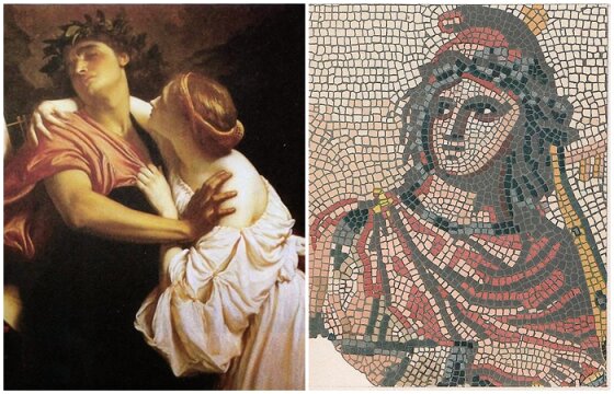 Слева направо: Орфей с лирой в окружении зверей (Византийский и христианский музей, Афины). \ Мозаика Орфея в Доминиканском музее, второй век н.э.