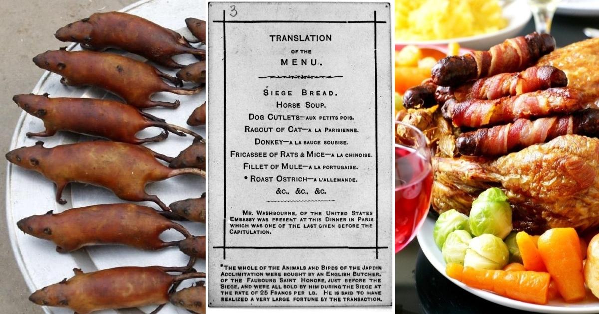 На Рождество 1870 года состоялась трапеза в ресторане Voisin. Она стала знаменита в истории благодаря меню. Оно было озаглавлено словами «99 дней осады», также прилагалась богатая винная карта. Первое блюдо меню – голова осла, фаршированная редисом, маслом и сардинами. На выбор предлагалось два супа: красный фасолевый с гренками и бульон из слона. Также в меню от Voisin были кошки, крысы, кенгуру в кунжуте, антилопа в трюфеле, а также волк в подливке из оленя.