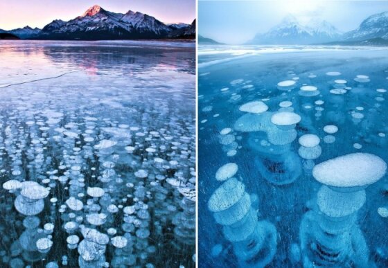 На Земле есть немало природных чудес, и озеро, которое, как в фантастическом фильме, наполнено огромными пузырьками – одно из самых невероятных. Зимой, когда этот расположенный в Канаде водоем замерзает, посмотреть на загадку природы съезжаются сотни людей. Походить по такому озеру, пофотографировать его или покататься на коньках – огромное удовольствие. Кстати, фотографии озера уже стали вирусными, многие даже считают их фотошопом. Однако никакого подвоха нет: Пузырчатое озеро реально существует.