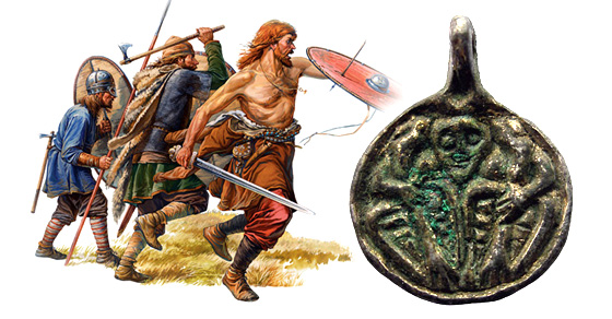 Первое, на чем бы хотелось сосредоточить внимание, это подвеска с изображениями Одина и сидящих у него на плече воронов: Хугина и Мунина. Согласно легенде, поутру он выпускал их лететь по белу свету, а к обеду они возвращались и сообщали хозяину все, что увидели и услышали. Изучению, в том числе этих привесок, посвящена работа Г.Ф. Корзухиной (2). В ней автор выделяет шесть известных на тот момент одинаковых по сюжету и датируемых 10 веком привесок.