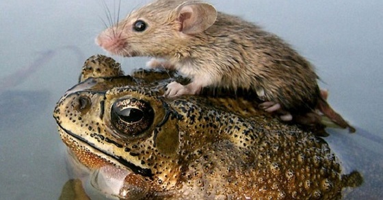 Мышь плывет на лягушке-спасительнице в паводковых водах на севере Индии в городе Лакхнау.