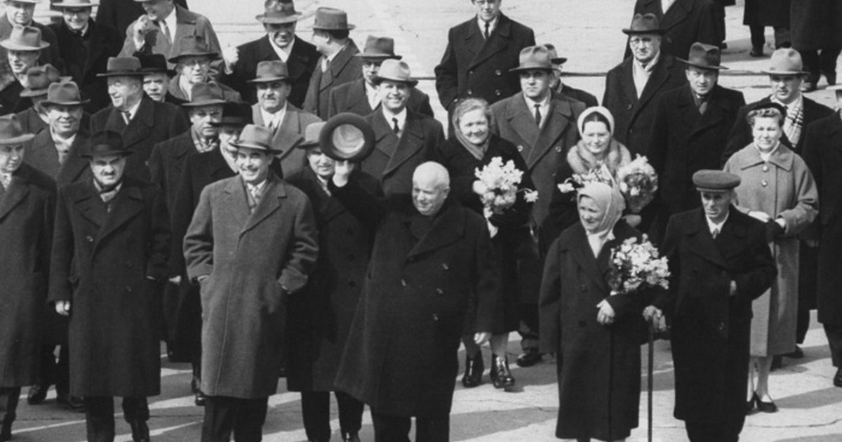 Никита Хрущев с делегацией в аэропорту встречает Юрия Гагарина.
