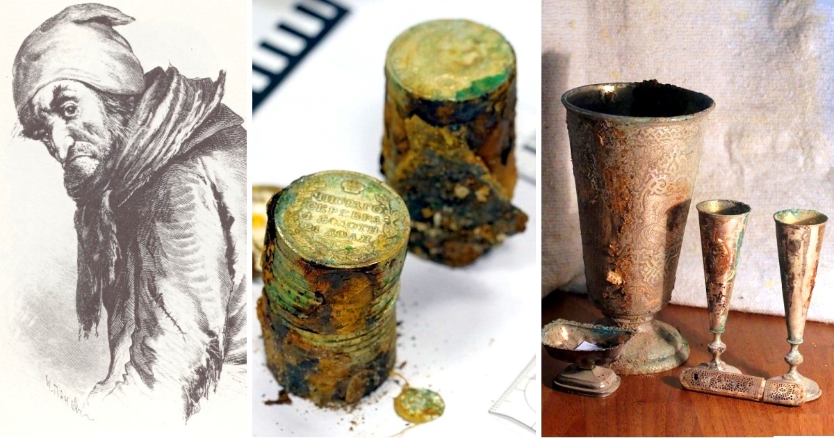 Во время раскопок старинного здания в Пскове археологи обнаружили клад Федора Плюшкина (1837- 1911) - российского купца и крупнейшего коллекционера Российской империи. Особо выдающимся в его коллекции был нумизматический отдел - 84 ящика редких монет. Такого в то время не было даже в Эрмитаже! Ведь не случайно часть коллекции выкупил сам император Николай II. Может показаться мистикой, но легендарный персонаж гоголевский Плюшкин определил судьбу будущего коллекционера, которому на момент публикации романа было всего 5 лет.