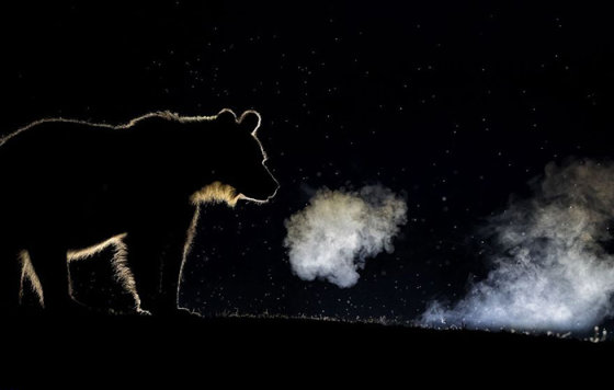 Бурый медведь рычит, предупреждая непрошенного гостя о своем присутствии. Его дыхание медленно исчезает в безветренной погоде.
