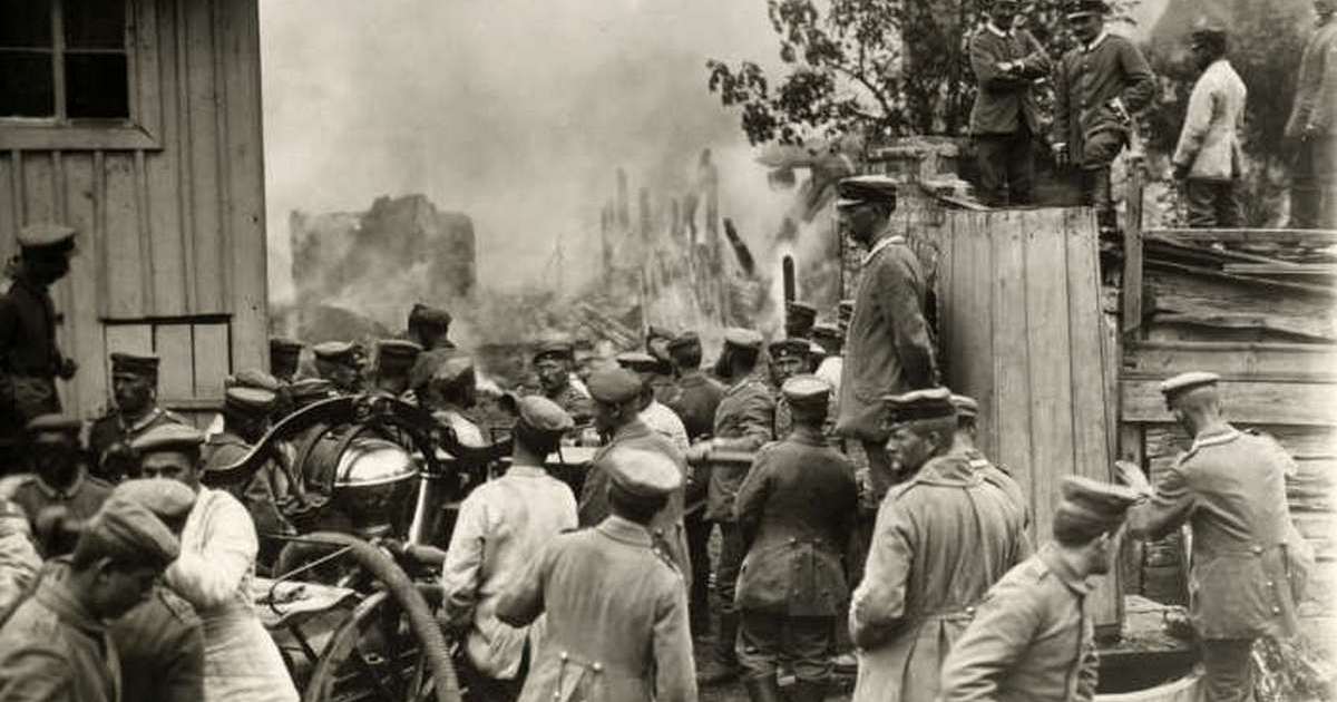 Немцы выносящие мешки с зерном из горящих складов. Брест-Литовск, 1915 год.