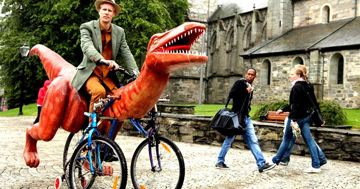 Норвежский художник протестует с помощью динозавра на велосипеде.