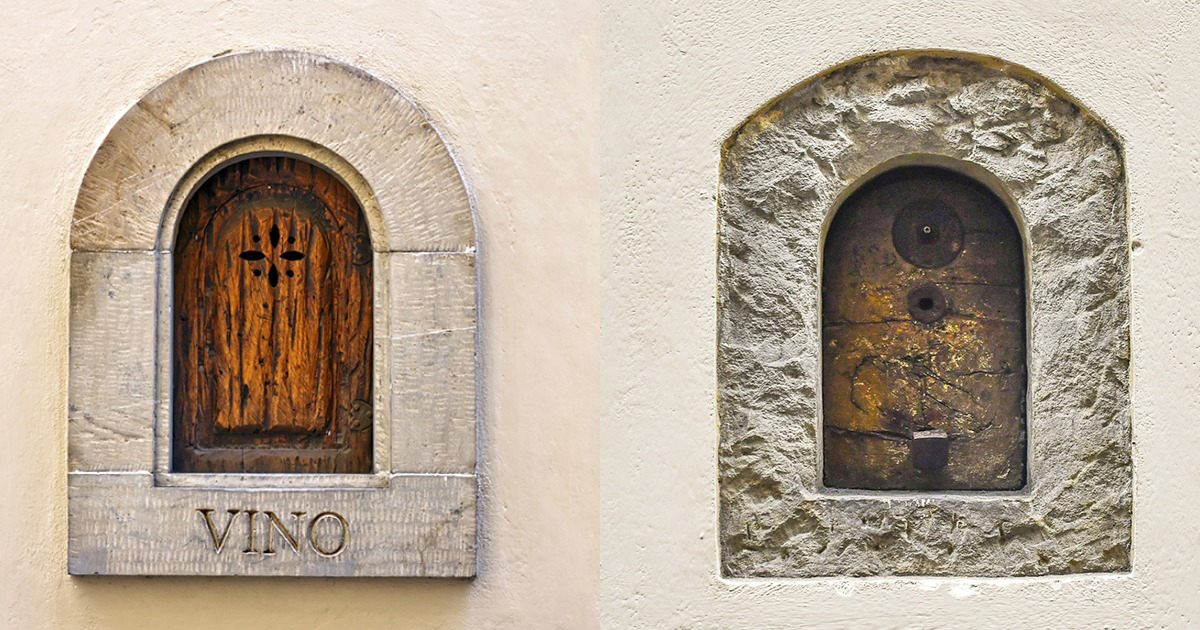 Часть уникальной флорентийской архитектуры, очаровательные маленькие «винные окна» снова используются для подачи клиентам вина, коктейлей и других напитков. Рука подающая бокал вина или иной напиток выглядит несколько сюрреалистично. Зато это находка, как для клиентов, так и для бизнесменов.