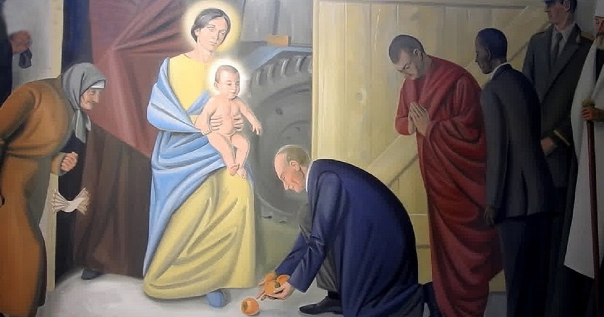 В центре картины изображена Дева Мария, держащая на руках маленького Иисуса. Однако вместо волхвов на фреске можно разглядеть личностей, напоминающих мировых лидеров. Создатель этой работы минский художник Владимир Кондрусевич охарактеризовал свою работу так: