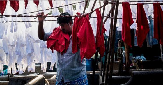 Повсюду моющие средства, хлорка и белье, развешанное на веревках, - это Дхоби Гат, крупнейшая в мире прачечная под открытым небом, расположенная в трущобах в самом сердце Мумбаи, финансовой столицы Индии. В этой прачечной работают только мужчины и благодаря им в ресторанах Мумбаи на каждый стол кладут чистую скатерть, а в больницах города всегда свежие простыни.