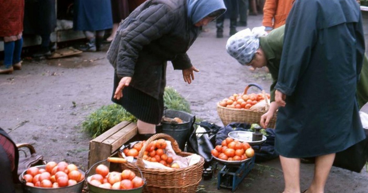 Женщина, продающая помидоры на уличном рынке. СССР, Новосибирск, 1969 год.