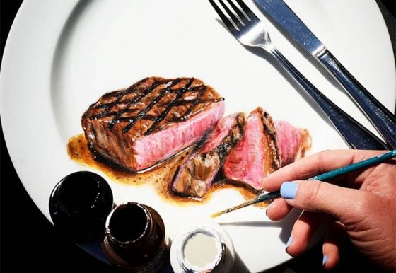 Талантливая художница из Торонто Жаклин Пуарье (Jacqueline Poirier), более известная в социальных сетях как TheCrazyPlateLady очень любит разрисовывать фарфоровые тарелки. Однако она изображает на них не традиционный орнамент, а фрагменты различных кулинарных блюд. Рисунки выполнены очень мастерски и, с первого взгляда можно подумать, что на тарелках лежат настоящие стейки.