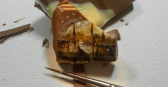 Талантливый турецкий художник, который стал широко популярен благодаря своим крошечным картинам, представил новую серию удивительно миниатюрных произведений живописи, в этот раз выполненных исключительно на луковой шелухе, кусочках шоколада, орехах и других продуктах питания.