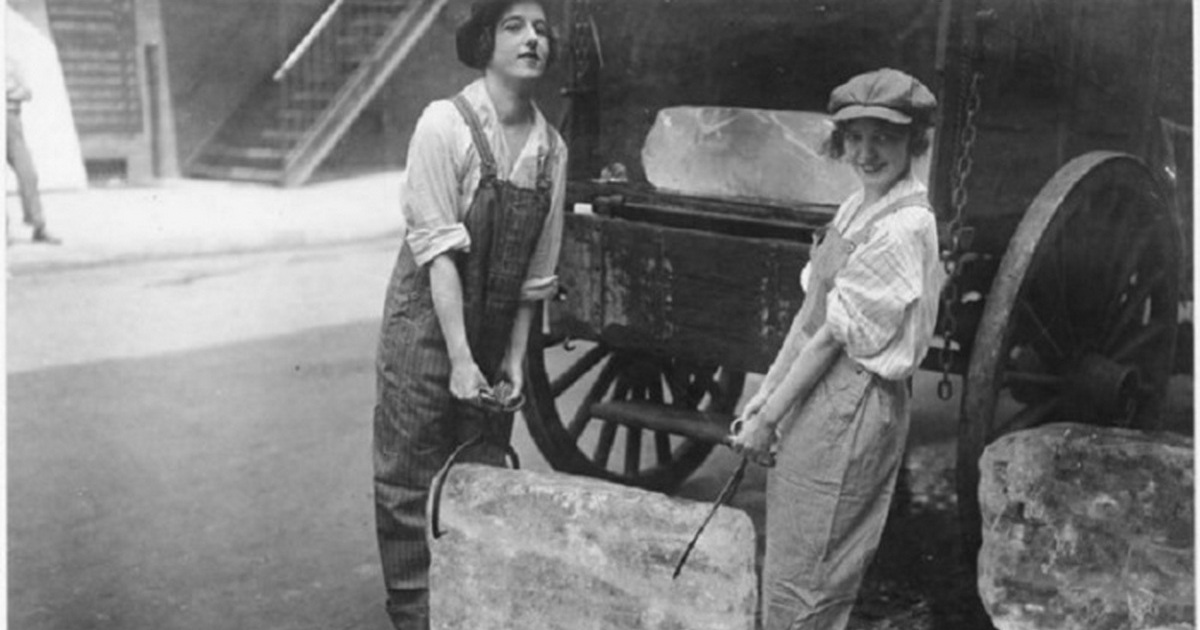 Девушки занимаются погрузкой тяжёлых блоков льда во время войны.