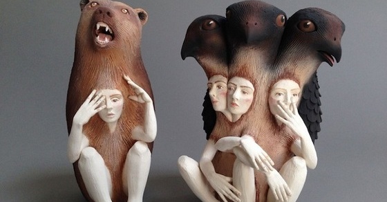 Американская художница создает керамические скульптуры, основой которых являются человеческие фигуры, заключенные в тела животных. Они представляют собой медитативные образы, бесстрастно созерцающие окружающий мир.