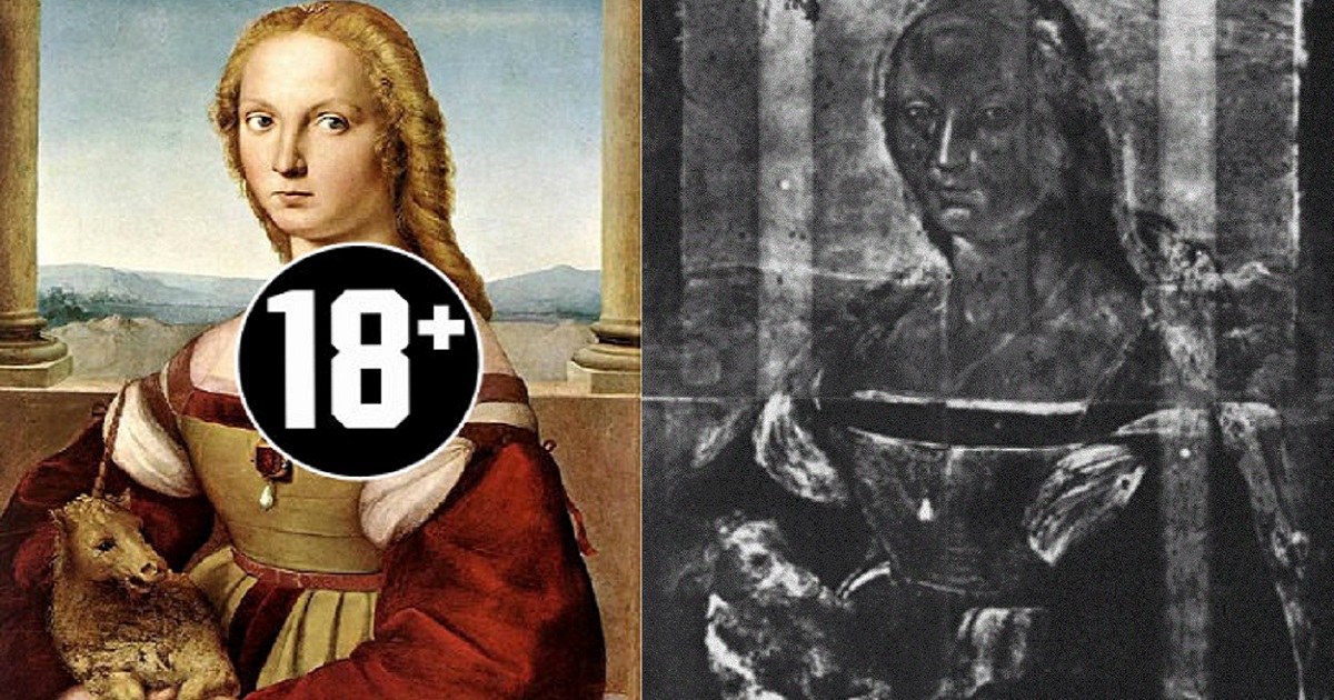Слева: Дама с единорогом. Рафаэль, ок. 1506 г. Справа: Рентгеновский снимок картины.