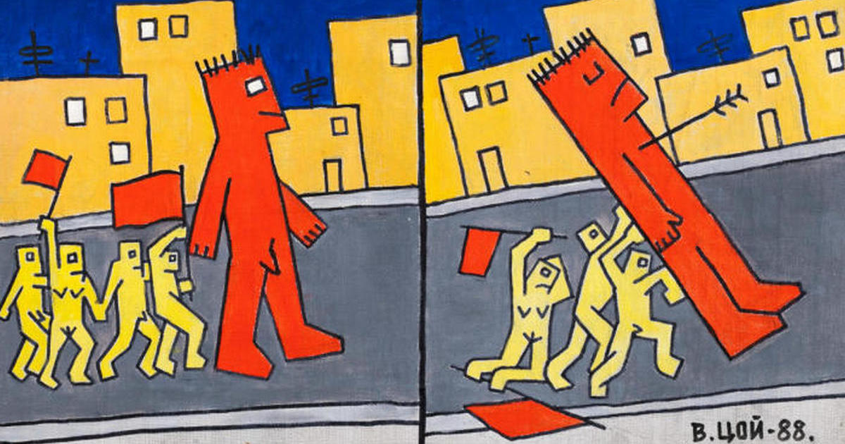 Картина, проданная вчера на аукционе (названия у нее нет), представляет собой как бы два кадра. На одном маленькие схематичные человечки с красными флагами шествуют за гигантом-лидером. Во второй «серии» лидер, сраженный стрелой, падает на своих «последователей» и они изо всех сил пытаются его удержать. Безусловно, автор вложил в этот рисунок какой-то философский смысл и чувства, навеянные противоречивыми 80-ми. Тем более что в те времена в творческом окружении Виктора был очень популярен культ героя, закончившего жизнь трагически – например, как Маяковский и Гагарин.